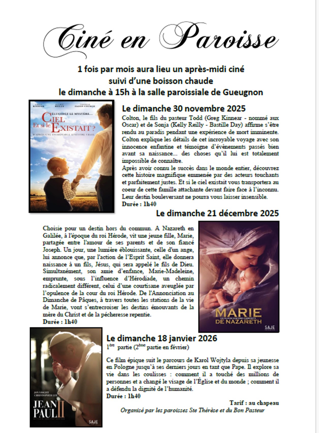 • CINE EN PAROISSE, DIMANCHES 30 NOVEMBRE, 21 DECEMBRE, 18 JANVIER A 15h00 au Centre paroissial de Gueugnon